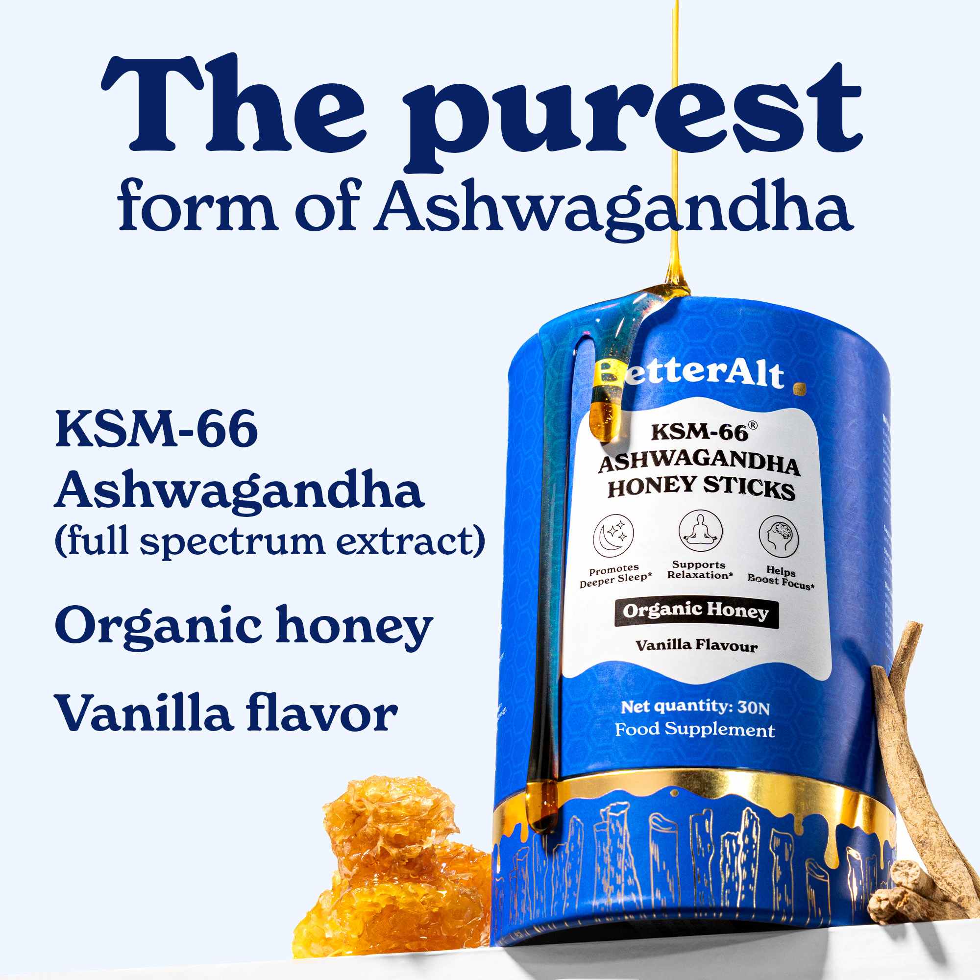 - BetterAlt’s KSM-66 Ashwagandha Honey Sticks are an easy and delicious way to unwind and support your mental and physical well-being. These honey sticks combine the power of 400 mg of KSM-66 Ashwagandha with organic Himalayan multiflora honey and a touch of natural vanilla flavor to promote relaxation, improve focus, and support restful sleep.
